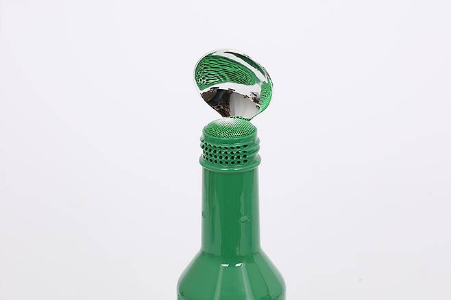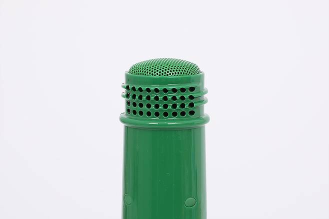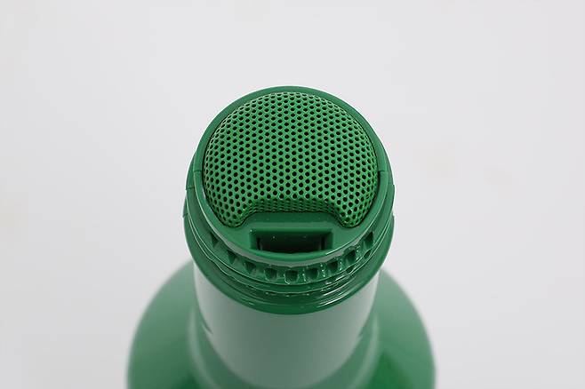 본체 윗면에는 녹색 마이크 그릴이 병뚜껑 대신 씌워져 있으며, 윗면 한쪽에는 숟가락을 꽂는 구멍이 뚫려 있다.