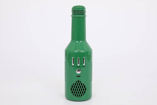 참이슬 숟가락 블루투스 마이크 M60의 뒷면은 진짜 참이슬 후레쉬와는 사뭇 다르다. 세 개의 길쭉한 타원형 버튼 세 개와 원형 버튼 하나, 그리고 USB 포트와 물방울 형상의 스피커 그릴이 모여 있는 것을 확인할 수 있다.
