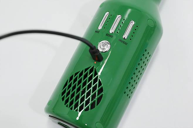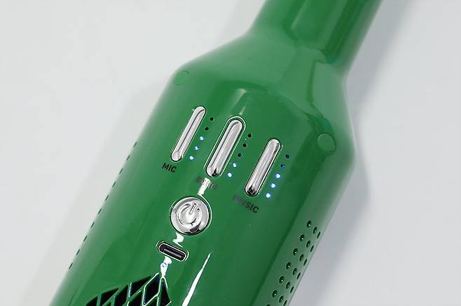 충전 완료 후 전원 버튼을 길게 눌러서 전원을 켜면 충전 포트 아래의 상태 LED가 푸른색으로 켜지며, 마이크와 에코, 뮤직 버튼 옆의 LED도 푸른색으로 켜진다. 세 개의 버튼으로 마이크와 에코, 반주 음원의 볼륨을 조절할 수 있으며, 버튼 옆의 LED로 설정 상태를 알 수 있다.