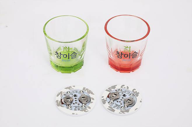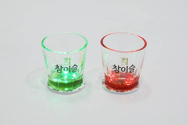 함께 제공되는 컬러 소주잔은 8가지 색상 중 랜덤으로 2개가 제공되며, 소주잔 아래에 붙이는 LED 발광 스티커도 함께 제공되어서 분위기를 더욱 높여준다.
