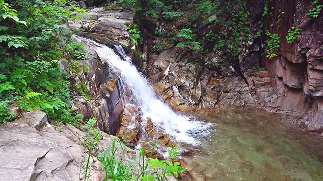 중류로 향하면 색다른 풍경이 기다린다. 잘라놓은 시루떡처럼 생긴 제3곡 떡바위, 절벽이 맞서 서 있는 제5곡 쌍벽, 여인의 치마폭처럼 물줄기가 펼쳐지는 제7곡 쌍곡폭포는 보는 순간 절로 감탄이 터져 나온다. 이 구간은 군자산 등산로와 연계해 트레킹 코스로 즐기기에도 알맞다.