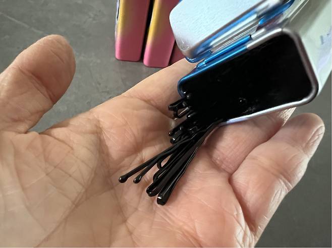 외출이나 여행할 때 필수로 챙겨 다녀야 하는 액세서리들, 핀, 고무줄 등등은 자잘해서 사실 잃어버리기 좋아요. 이것도 이 사탕케이스에 보관하면 잃어버리지 않고 찾아 사용하기도 편해요.