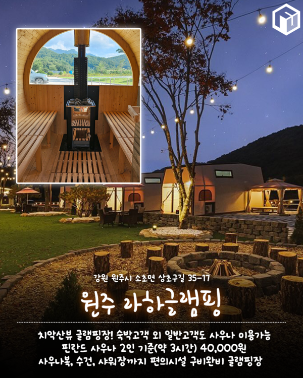 글램핑과 함께 핀란드 사우나를 즐길 수 있는 원주 라하글램핑장입니다. 강원도 원주시 소초면에 위치한 라하글램핑은 치악산뷰의 글램핑장으로 숙소 깨끗한 시설과 특히 밤에는 미니 알전구가 켜저 낭만적인 캠핑을 즐길 수 있는 곳인데요.