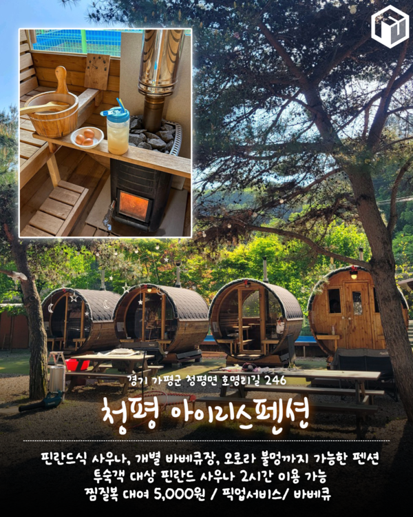 핀란드식 사우나를 즐길 수 있는 강원도 청평에 위치한 청평 아이리스 펜션입니다. 아이리스 펜션은 투숙객 대상으로 핀란드 사우나를 2시간 이용 가능한데요. 그 외 개별 바베큐, 픽업서비스 그리고 오로라 불멍까지 가능한 만능 펜션입니다.