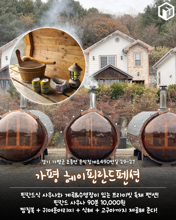 경기도 가평에 위치한 프라이빗 독채 펜션 헤이핀란드 펜션입니다. 헤이핀란드펜션은 프라이빗한 개별 독채 펜션으로 연인, 가족, 친구들과 함께 방문하기 좋은 펜션인데요. 특히 펜션 인근 계곡과 수영장과 핀란드 사우나까지 이용 가능합니다.