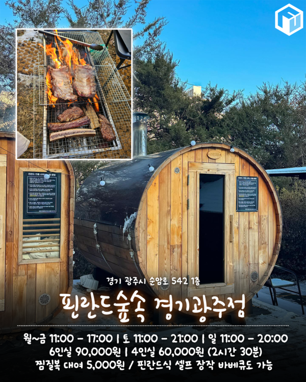 원통형, 사각형, 올리브형 등 다양한 형태의 핀란드 사우나가 있는 핀란드 숲속 경기 광주점입니다. 이용 요금은 3시간 기준 4인실 60,000원이며 인원 추가 시 추가 요금이 발생합니다.