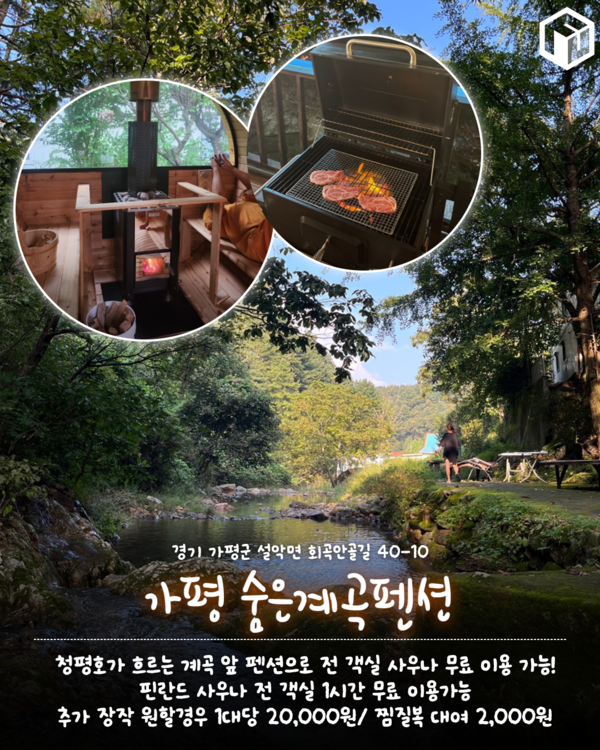 청평호가 흐르는 계곡 앞 펜션으로 전 객실 사우나 무료 이용 가능 가평 숨은계곡펜션입니다. 전 객실 1시간 핀란드 사우나 가능하며 추가 장작 원할경우 1대당 20,000원을 지불하면 됩니다.