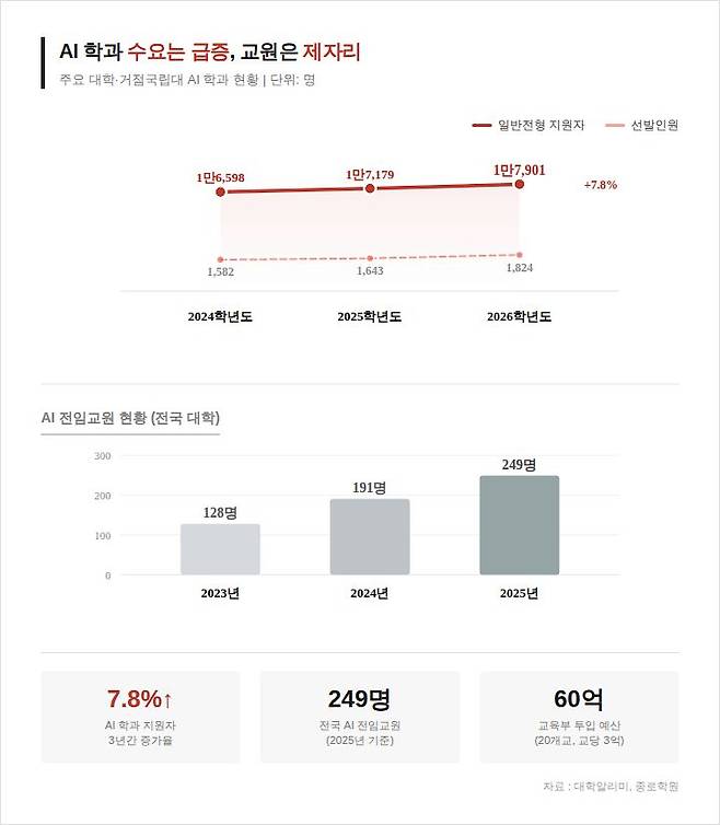 대학알리미에 다르면 전국 대학의 AI 관련 전임교원은 249명(2025년)에 불과하다. 2023년(128명)에 비해 두 배가량 늘었으나, 전국적인 AI 교육 수요를 감당하기에는 부족한 수준이다. 서울의 한 사립대 교무처장은 “주요 대학의 AI 학과가 컴퓨터공학이나 사이버보안 전공 교수를 겸임 형태로 채용하고 있다”며 “현직에서 일하는 분들을 겸임 교수 형태로 모셔오는 것도 보수, 수업 운영 측면에서 결코 쉬운 일이 아니다”라고 말했다.