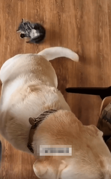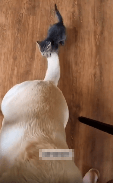 넓은 바닥 위, 커다란 강아지 한 마리가 조용히 앉아 있습니다. 움직임 하나 없이 안정된 자세로 앉아 있는 강아지의 등 뒤, 가장 눈길을 끄는 건 길고 두툼한 꼬리. 그 꼬리 끝에 뜻밖의 존재가 매달려 있습니다. 아직 털이 보송보송한 작은 새끼 고양이 한 마리가, 앞발로 강아지의 꼬리를 꼭 움켜쥔 채 대롱대롱 매달려 있는 모습이죠.