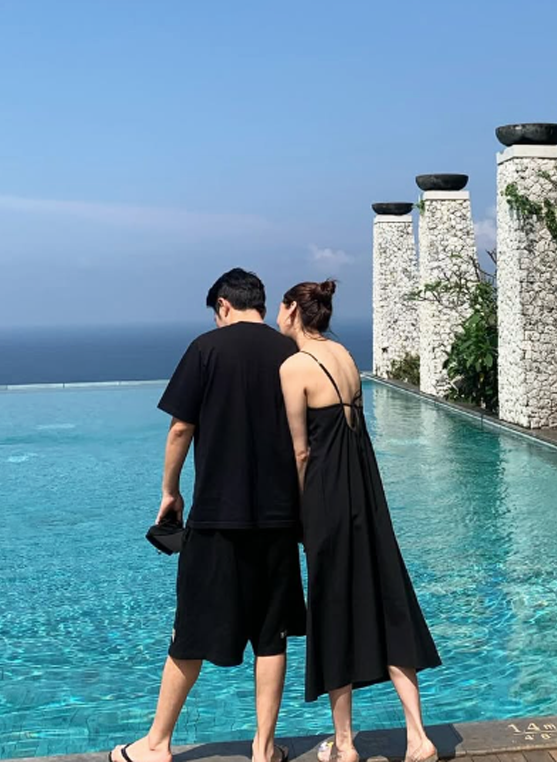 허리 라인을 잡아주는 디자인이 전체적으로 슬림한 분위기를 연출하며, 가느다란 어깨 끈이 여성스러운 무드를 한층 더 강조했다.