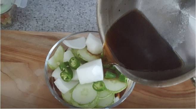 양파, 오이, 청양고추, 간장, 설탕, 식초, 물