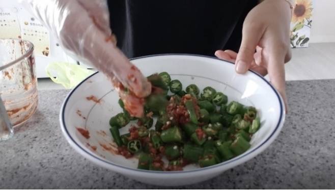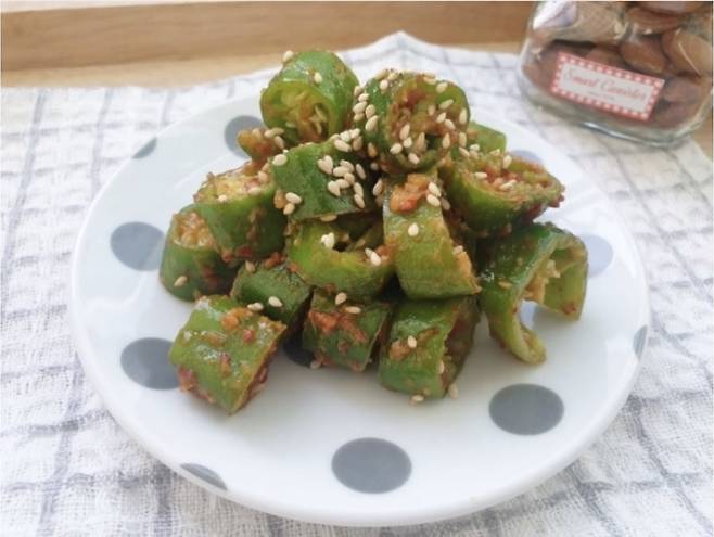 오이맛고추를 2~3cm 정도 썰어준 뒤 양념장을 잘 버무려주면 끝!!