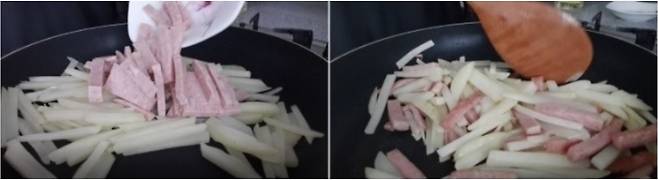 3. 팬에 오일을 두르고 감자를 먼저 볶다가 스팸을 넣고 익혀주세요