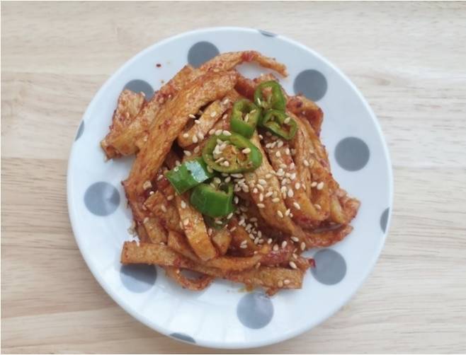 사각어묵, 청양고추, 다진 마늘, 고춧가루, 간장, 설탕, 올리고당, 참기름, 통깨