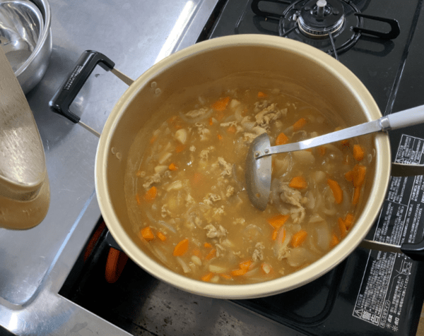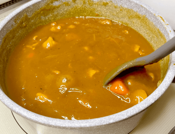 재료가 잠길 만큼 물을 붓고 끓기 시작하면 불을 줄인다. 카레 블록은 한 번에 넣지 말고 나눠 넣어 저어가며 녹인다. 그래야 덩어리가 생기지 않는다. 중약불에서 천천히 끓이면 점도가 자연스럽게 올라온다. 이 단계에서 맛을 한 번 본다.