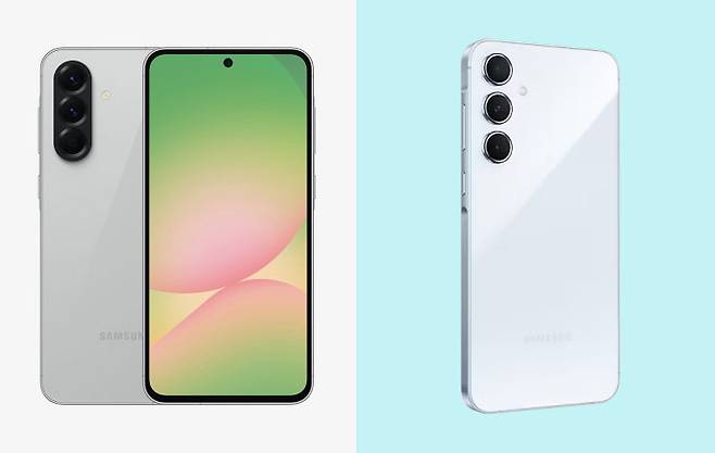 이전 모델인 A55 디자인과 비교해보면 A55는 메탈과 글래스 소재가 적용되어 유광 마감이 특징인 반면, A56은 무광의 매트한 질감을 보여준다. 색상 또한 A55는 팝한 색감과 그라데이션이 적용된 아이스블루, 라일락, 네이비까지 세 종류인데 A56은 차분한 색감의 핑크, 올리브, 라이트 그레이, 그라파이트까지 네 종류로 나왔다. 후면 카메라 디자인 또한 전작은 카메라 렌즈 3개를 일자로 배치한 반면, 신작은 블랙 카메라 링을 추가했다.