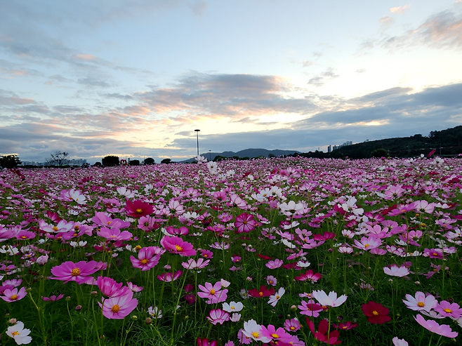 맑은 가을 하늘 아래 걷다 보면 꽃길이 끝없이 이어지고, 가끔은 멀리 자전거를 타는 사람들의 실루엣이 그림처럼 스쳐 간다. 가까운 도심에서 힐링 산책을 즐기기 좋은 곳으로 손꼽히는 이유다.