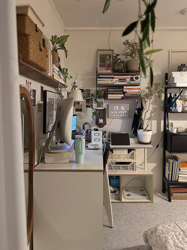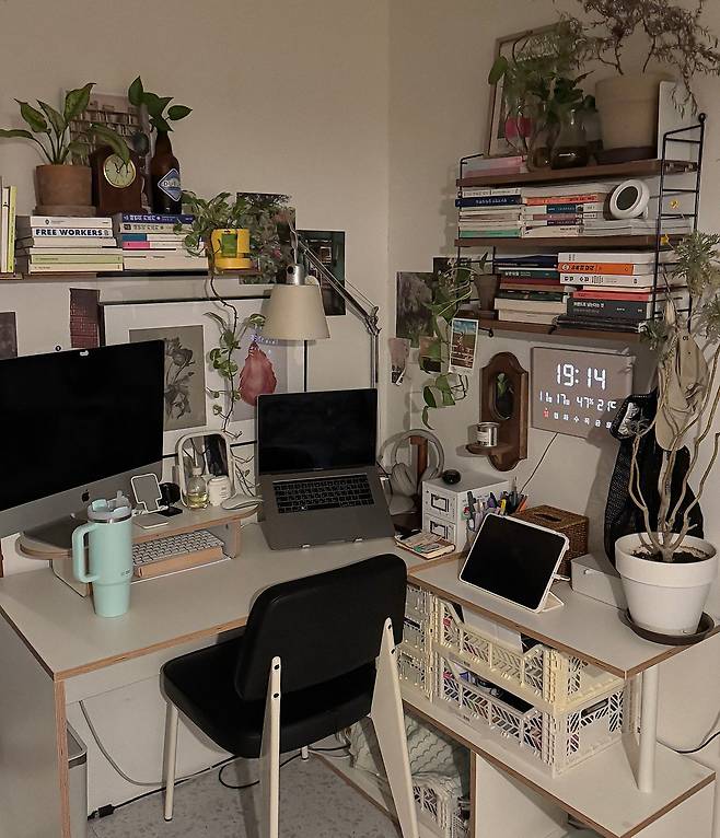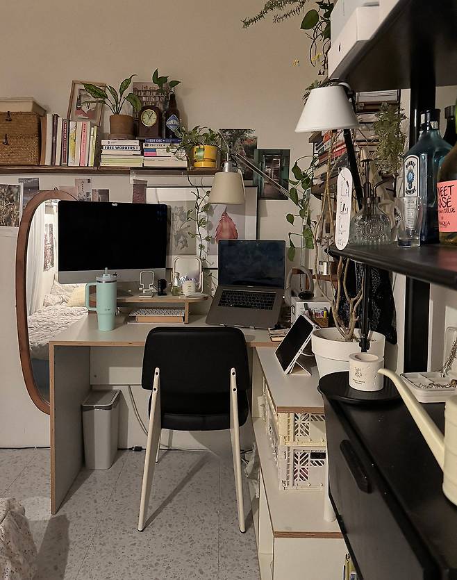 그럼 지금부터 제 방을 소개해 드릴게요. 먼저 데스크 테리어 공간으로, 집에서 일하는 시간이 긴 만큼 가장 공을 들여 꾸미는 공간이에요. 원래는 작은 테이블을 책상으로 사용했었는데, 데스크탑과 노트북, 패드, 스케줄러 등 한 번에 여러 가지 일을 해야 해서 넓은 책상이 무조건 필요하더라고요.