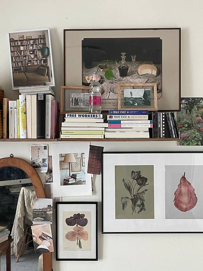 겨울에는 가랜드로 된 크리스마스트리를 올리면 연말 분위기가 물씬 납니다. 본가로 이사해 들어오면서 산 정물화 그림들과 킨포크 가든에서 떼낸 꽃 일러스트들을 액자에 넣어 벽 선반에 올렸는데 제가 원하던 느낌이라 마음에 들어요.