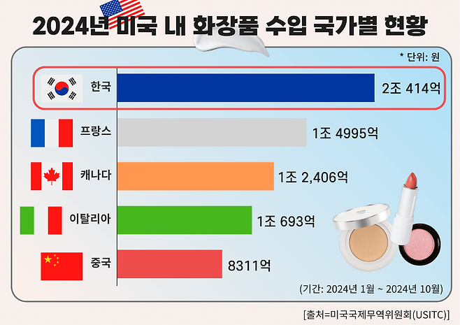 미국국제무역위원회(USTIC)가 발표한 미국 내 화장품 수입 통계에 따르면, 지난해 1~10월 동안 미국에 수입된 한국 화장품 규모는 14억516만 달러(약 2조414억 원)로 집계됐다. 이는 2023년 연간 수입액인 11억 달러(약 1조6000억 원)를 크게 넘어선 수치다.