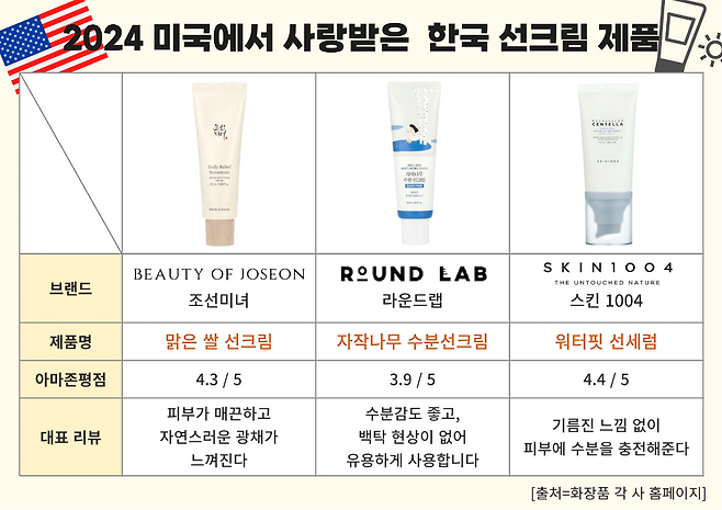 특히 스킨1004의 ‘워터핏 선세럼’, 라운드랩 ‘자작나무 수분 선크림’, 조선미녀 ‘맑은 쌀 선크림’이 대표적인 인기 제품이다. 조선미녀의 ‘맑은 쌀 선크림’은 아마존에서 선크림 부문 1위를 차지할 정도로 큰 인기를 얻고 있다.
