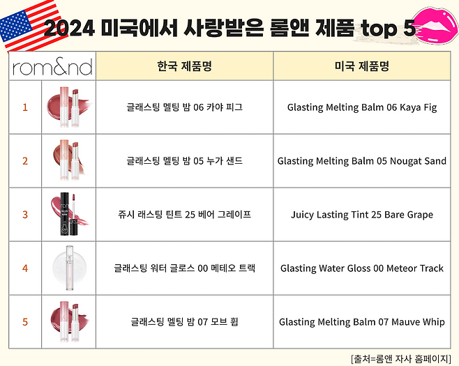 지난해 상반기 롬앤에서 발표한 미국 소비자들에게 가장 많이 판매된 제품은 ▲ 글래스팅 멜팅밤 06 카야 피그 ▲ 글래스팅 멜팅 밤 05 누가 샌드 ▲ 쥬시 래스팅 틴트 25 베어 그레이프 ▲ 글래스팅 워터 글로스 00 메테오 트랙 ▲ 글래스팅 멜팅 밤 07 모브 휩 등이었다.