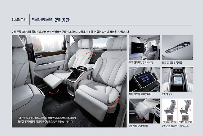 후석 엔터테이먼트 시스템은 14인치 대화면으로 넷플릭스 및 유튜브 등 스트리밍 콘텐츠 시청이 가능하며, 슈퍼 서라운드 시스템은 우퍼와 듀얼 램프 일체형으로 입체적인 음향 시스템을 구현했다. 이처럼 렉스턴 써밋은 풍부한 2열 편의 사양과 최상의 공간성을 확보했다.