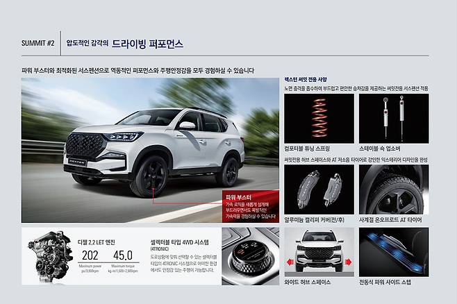 렉스턴 써밋의 외관은 20인치 블랙 휠과 올터레인(All-Terrain) 타이어, 허브 스페이스를 통해 당당한 외관을 자랑한다. 특히 전용 스테이블 쇼크업소버와 컴포터블 튜닝 스프링을 적용해 다양한 주행 환경에서 안락한 승차감을 제공하며, 윤거를 확대해 코너링 성능을 높였다.