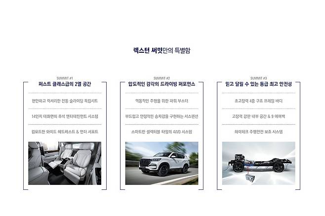 렉스턴 써밋(Summit)은 한국형 럭셔리 SUV의 시작을 알렸던 '무쏘'를 연상시킨다. 강인한 바디-온 프레임 차체에 메르세데스-벤츠의 파워트레인을 적용한 KGM(구 쌍용차)의 상징과 같은 모델로, 당시 상용차 성격이 강했던 SUV 속에서 고급 승용 SUV 시장 개척에 성공했다.