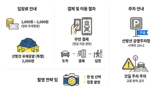 산방산을 정면으로 담을 수 있는 구도의 밭은 2,000원을 받는 경우가 많다. 대부분 현금 또는 계좌이체 방식의 무인 운영 형태로, 안내문에 따라 요금을 지불하는 구조다.