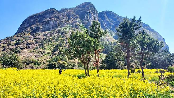 명승 제77호인 산방산(395m)의 웅장한 암벽이 배경이 되면서 풍경은 더욱 입체적으로 완성된다. 꽃과 암벽, 하늘이 어우러진 장면은 3월 제주에서 놓치기 아쉬운 봄의 정취를 전한다.