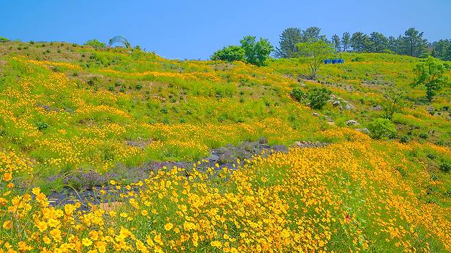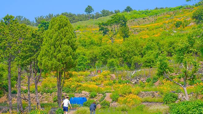 바다를 마주한 언덕에 흐드러지게 핀 금계국. 봄과 여름의 경계에서 피어난 이 꽃들은 거제의 새로운 얼굴을 보여주며, 계절의 전환점을 시각적으로 체감하게 만든다.