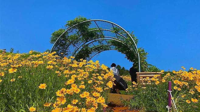 금계국 사이사이에 놓인 벤치는 여유롭게 풍경을 즐기기 좋고, 산책로 왼편으로는 초승달 포토존이 숨어 있어 특별한 사진을 남기기에도 그만이다.