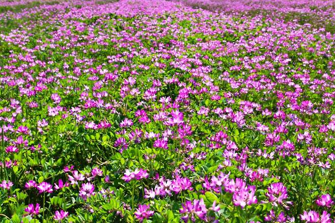 올봄, 사천시는 무지개 해안도로 주변에 대규모 자운영 꽃단지를 조성했다. 3만㎡ 넓이의 농지에 붉은 토끼풀을 닮은 자운영이 만개해 해안도로의 화려한 색감과 어우러지며 이색적인 장관을 이룬다. 자운영은 봄마다 보랏빛 꽃을 피우는 두과 식물로, 경관용뿐 아니라 땅을 비옥하게 만드는 녹비작물로도 잘 알려져 있다.