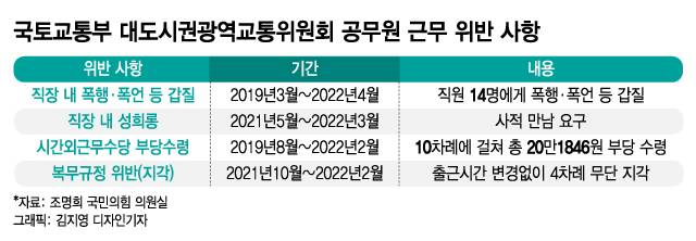윤석열 정부가 부처·공공기관 혁신을 추진하는 가운데 국토교통부 대도시권광역교통위원회(이하 대광위) 공무원의 직장 내 성희롱, 폭행·폭언 등 갑질 행위가 뒤늦게 드러났다. 그는 자신의 우월적 지위를 이용해 수 개월에 걸쳐 다른 직원에게 수차례 사적만남을 요구했다. 또 근무시간에 개인용무를 보고 시간외근무 수당을 부당하게 신청하는 등 불성실한 근무태도도 적발됐다.
