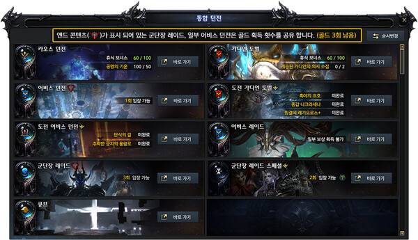 다만 이전에는 군단장 레이드 입장을 3회만 가능했다면 이젠 골드 보상과 별개로 전부 1회씩 입장 가능하다. 또한 골드 획득 비지정 캐릭터는 더보기 무료 3회 기회를 얻게 된다.