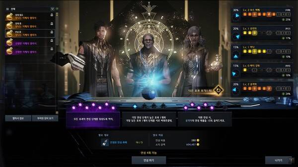 옵션을 채운 이후 연성 단계를 올린다. 이때 세 현자는 특별히 원하는 효과를 선택하게 해 주거나 특정 효과는 봉인하는 등 다양한 조언을 건넨다. 화면에서는 '모든 효과 연성 단계를 뒤섞는다', '가장 연성 단계가 높은 효과 1개와 가장 낮은 효과 1개 단계를 서로 바꿔주겠다', '이번 연성 시 공격력 연설 확률을 15% 올려주겠다' 등 다양한 조건을 확인할 수 있었다.