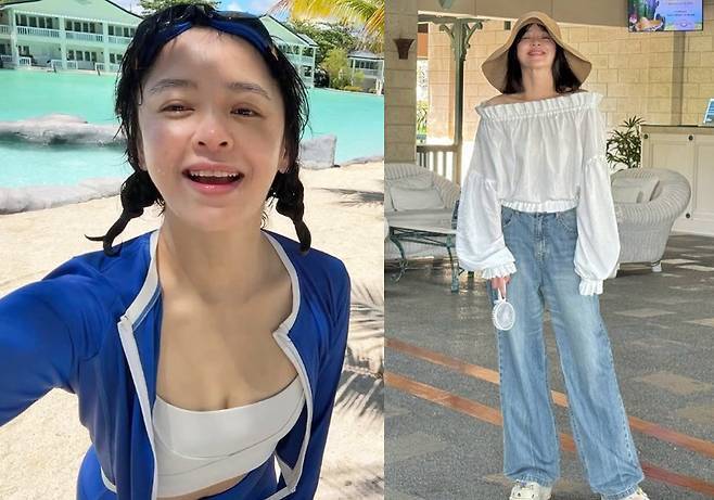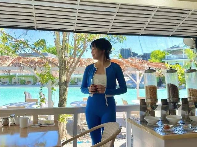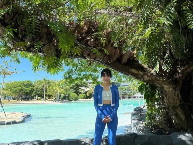 에메랄드빛 풀장을 배경으로 블루 래시가드 세트와 화이트 크롭톱을 매치해 스포티하면서도 세련된 바캉스룩을 완성했습니다.