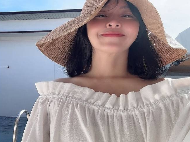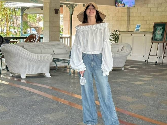 이어진 컷에서는 오프숄더 퍼프 블라우스에 와이드 핏 데님 팬츠를 매치해 편안하면서도 스타일리시한 꾸안꾸 룩을 연출했습니다.