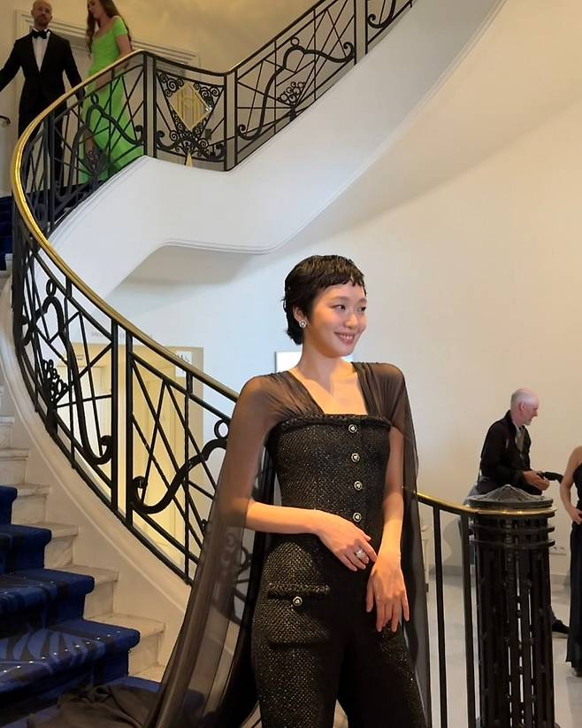 화려한 실내 계단에서 김고은이 블랙 글리터 소재의 세트 의상을 착용하고 있다. 버튼 디테일이 돋보이는 상의와 매치된 하의는 반짝이는 소재감으로 고급스러움을 더하고 있으며, 브라운 톤의 시스루 케이프를 함께 매치해 드라마틱한 분위기를 연출하고 있다. 짧은 헤어스타일과 자연스러운 메이크업은 의상의 화려함을 더욱 돋보이게 하며, 우아한 곡선형 계단과 고급스러운 인테리어를 배경으로 한 모습이 마치 영화 속 한 장면처럼 연출되고 있다.