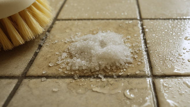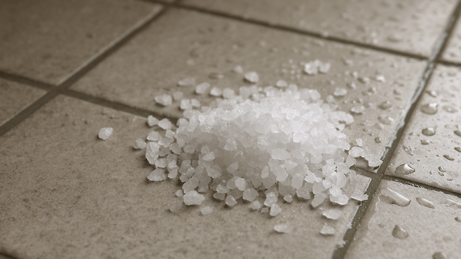 굵은소금은 일반 세제와 달리 입자의 크기와 거칠기 덕분에 강한 마찰력을 낸다. 이 물리적 마찰이 타일 틈새에 낀 곰팡이, 물때, 비누 찌꺼기를 긁어내는 데 도움을 준다. 표면을 손상시키지 않으면서도 오염층만 부드럽게 벗겨내는 점이 특징이다.