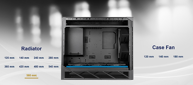 또한, 이전 영희 케이스 대비 개선된 점도 눈에 띈다. 수랭 시스템을 위한 라디에이터 지원. 최대 560mm를 지원한다. 압도적이다. 전면 최대 280mm, 상단 최대 480mm, 하단 최대 560mm을 지원한다. 이 정도면 극한의 수랭 시스템에도 대응할 수 있다.