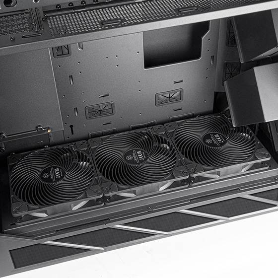 일단 아래에서 위로 공기를 보내는 굴뚝형 쿨링을 특징으로 삼았으니, 당연히 하단에서 차가운 바람을 쏘아올리는 쿨링팬의 성능도 좋아야 하겠다. ALTA F2 하단에는 Air Penetrator 184i PRO 180mm 팬 3개가 기본 장착된다. 아주 커다란 180mm 대형 팬 세 개가 모여 차가운 바람을 동시에 빨아들여 아래에서 위로 공기를 강하게 밀어 올리는 것이다. 이 과정에서 케이스 내부의 사각지대도 거의 다 사라진다.