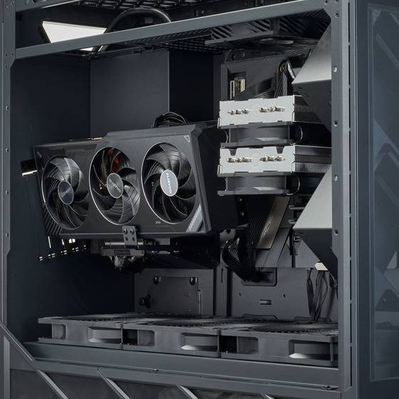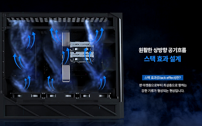 그래픽카드가 약간 앞으로 기울어졌기 때문에, CPU와 그래픽카드가 각각 독립된 차가운 공기를 흡입할 수 있다. 다시 말하자면 두 부품의 열이 서로 뒤섞이지 않고, 바닥에서 들어온 신선한 공기를 각각 받아들이게 된다. 뜨거워진 서로의 공기를 불쾌하게 나눠 들이마실 필요가 없는 것이다. 이후 배출도 위쪽으로 곧장 빠져나가, 열이 케이스 내부에 머무르지 않는다.