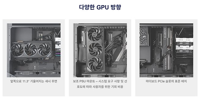 ALTA F2의 또 하나의 특징은 그래픽카드와 CPU를 분리하는 발열 제어 설계다. 케이스 후면의 PCI 슬롯(4개)이 앞쪽으로 11.3° 기울어진 구조를 갖췄는데, 이 기울기가 단순히 특이한 디자인을 위한 게 아니다.