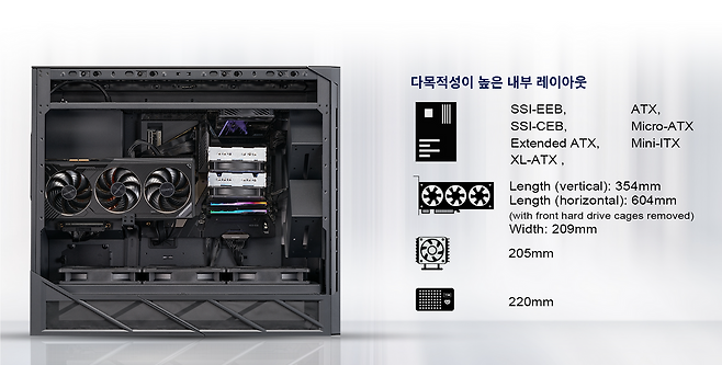 ALTA F2는 프리미엄 슈퍼 타워라는 슬로건에 걸맞게 사실상 제약이 거의 없는 하드웨어 호환성을 목표로 설계됐다. 하이엔드 게이밍 PC부터 전문가용 워크스테이션까지 모두 포용할 수 있는 것이다.