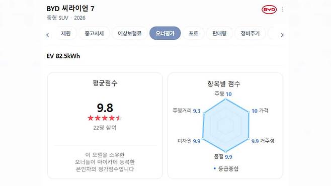 중국 전기차 브랜드 BYD의 중형 SUV ‘씨라이언 7’이 네이버 마이카 오너평가에서 평점 9.8점을 받으며 예상을 뒤엎는 반응을 끌어냈다.