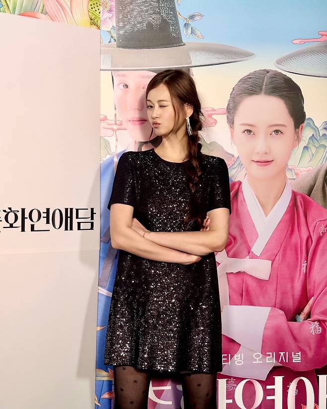 화려한 행사장에서 고아라가 블랙 글리터 미니 드레스를 입고 우아한 자태를 뽐내고 있다. 반짝이는 소재의 드레스는 짧은 기장에도 불구하고 품위 있는 실루엣을 유지하며, 시스루 블랙 타이츠와의 조화로 세련된 이브닝 룩을 완성하고 있다. 옆으로 땋은 헤어스타일은 드레스의 화려함 속에서도 여성스러운 부드러움을 더해주는 포인트로 작용하고 있다.