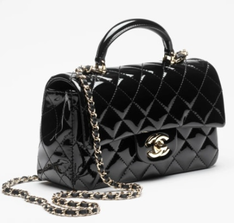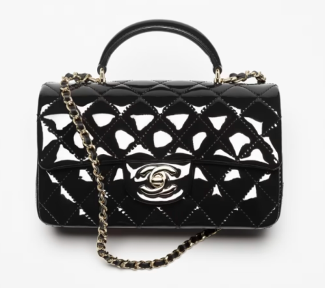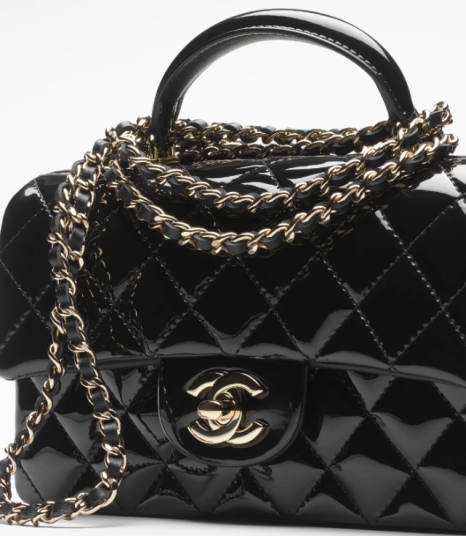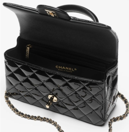이 가방은 24/25 FW 컬렉션을 대표하는 제품으로, 페이턴트 카프스킨으로 제작되어 유광의 매력이 돋보입니다. 블랙과 골드 메탈의 조화로 고풍스러운 느낌을 더했습니다.