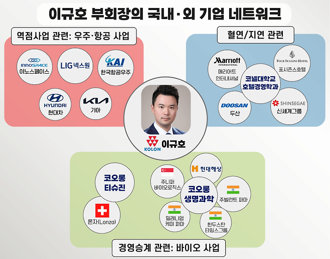 이 부회장 주도의 신사업 관련 기업과 더불어 경영승계 관련, 정·재계 네트워크 관련 기업 등도 함께 조명을 받고 있다. 지난해 12월 기준 이 부회장이 소유한 그룹 지주사 코오롱 지분은 0%다. 반면 코오롱의 최대주주이자 이 부회장의 부친인 이웅열 명예 회장의 지분율은 49.74%에 달한다. 24일 종가 기준 코오롱 주식의 1주당 가격은 2만4950원으로 이 명예회장 소유 지분의 가치는 1566억8096만원에 추산된다. 이 부회장이 그룹 지배력을 온전히 물려받으려면 단순 계산해도 약 800억원에 가까운 상속·증여세 재원이 필요한 셈이다.